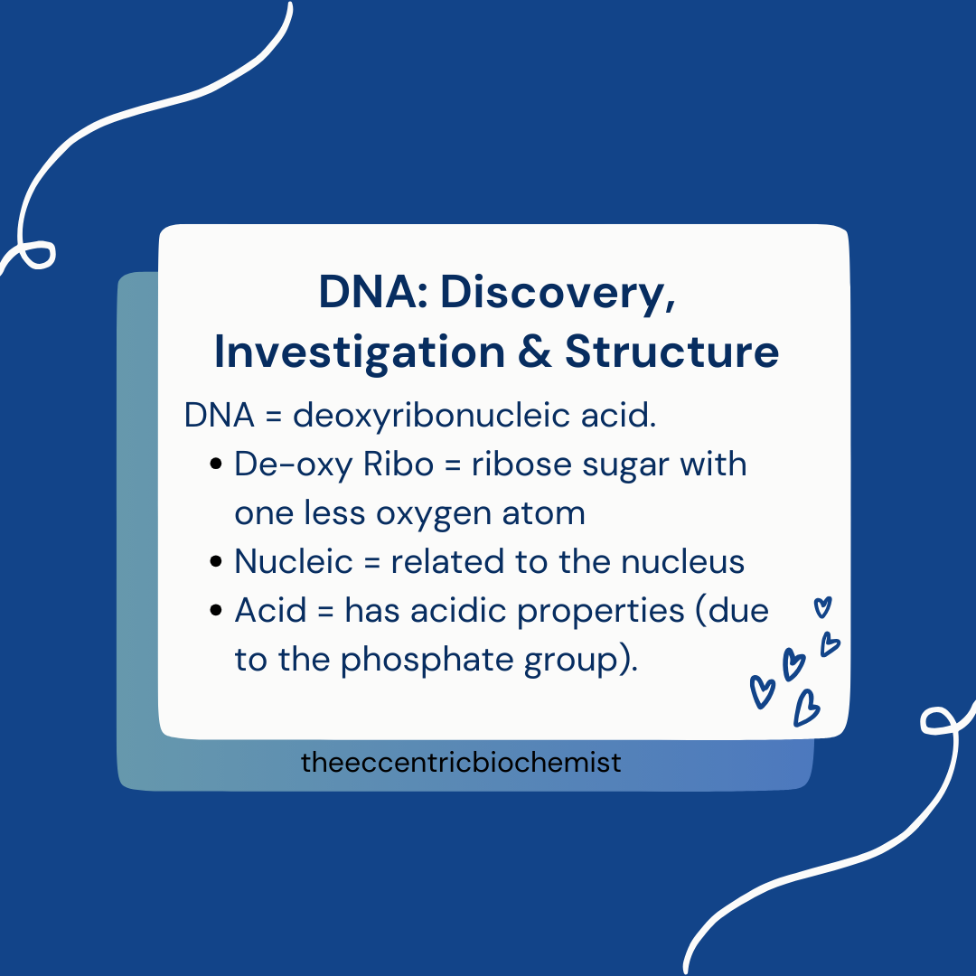 DNA is the abbreviation for deoxyribonucleic acid. This name is gotten from the chemical nature of DNA. To break it down;